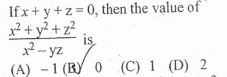 In this question, only a single equation is given, i.e., x + y + z = 0, and based on this equation we have to find the value of an expression