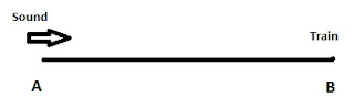 First consider a simple scenario when the train is not moving. When the two shots are fired from A, a person sitting in the train will hear them at an interval of 13 minutes only. The sound travels the distance from A to B.