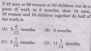 So, 10 men, 10 women and 10 boys complete 65/3 units of work in 1 month. To complete 120 units(half of the work), they will take = 120 * 3/65 = 72/13 months