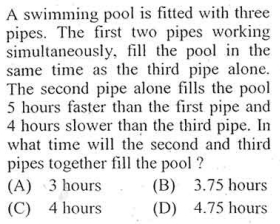 Let the second pipe fills the pool in X hours. Then first pipe takes (X+5) hours and the third pipe takes (X-4) hours to fill the pool. Now, 1st and 2nd pipe together take the same time to the fill the pool as the 3rd pipe alone. Hence,