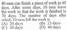 Now when 10 men quit, only 30 men were left to do the work and they took (70 – X) more days to finish it.