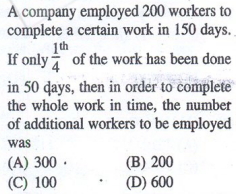 This is a very famous question. A company employed 200 workers to complete a certain work in 150 days. Here the total work is not 200*150 because 200 workers and 150 days was only a plan. In reality, only 1/4th of the work has been done in 50 days. So if they go with the same pace, 200 workers will take 200 days to complete the work.