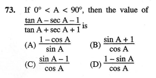 (tanA – secA – 1)/(tanA + secA + 1) = -√2/(2 + √2) = -1/(√2 + 1) = 1 – √2 (rationalize)